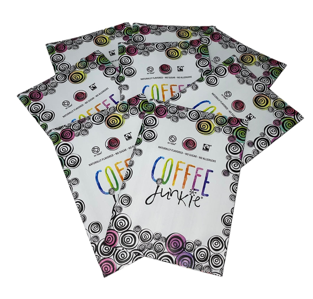 All coffees are available in DIY cold brew kits (includes a Coffee Junkie Mason Mug) and individual DIY cold brew pouches. Each pouch makes 16oz (a mason mug) of ready to drink cold brew.